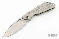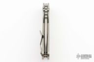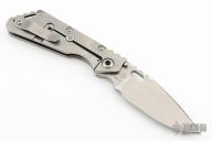 This Mick Strider Performance Series SMF framelock folder features a spear point blade with thumbhole and notched thumbrest. The handle has a stonewashed titanium frame with titanium clip, tip up carry. Jimping on blade spine. Includes Hinderer "Lock Bar Stabilizer" for maximum reverse lock retention. Nice detent, lockup and blade seating. New condition.