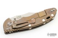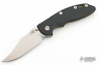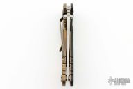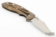 This XM-18 Bowie by Rick Hinderer Knives features a 3.5" stonewash finished blade, notched thumbrest and dual thumbstuds. The handle has a black G-10 scale, and bronzed stonewashed titanium handle/clip. Clip can be mounted for tip up or down carry. Tri-way pivot system.  Nice lockup, and detent. Includes the original box, extra hardware. New condition.