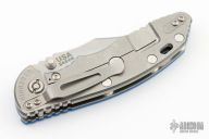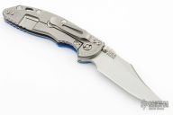 This XM-18 Bowie by Rick Hinderer Knives features a 3.5" stonewash finished blade, notched thumbrest and dual thumbstuds. The handle has a blue G-10 scale, and a stonewashed titanium handle/clip. Clip can be mounted for tip up or down carry. Tri-way pivot system.  Nice lockup, and detent. Includes the original box, extra hardware. New condition.