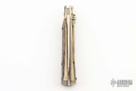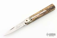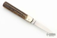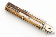 This leverlock auto by Hubertus features a high polish blade, nickel silver bolsters, stag scales, and brass liners and pins. Opens with a nice snap. Very fast opening. Has some scuffs, scratches, and patina, great condition otherwise.
