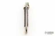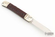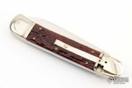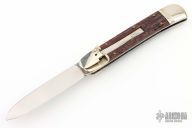 This lever lock auto by Rob Klaas features a polished stone wash finish drop point blade. The handle has nickel silver double bolsters and lever with brass liners and pins. Jigged scales. Strong firing auto with a little blade play. Has some light scuffs, scratches, and patina, great condition otherwise.