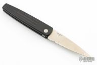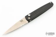 This Spike automatic by Benchmade Knives features a satin finished partially serrated blade and black anodized aluminum frame. Comes with vintage catalog sales paper. Has a couple light scuffs and scratches, excellent condition.