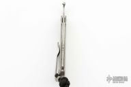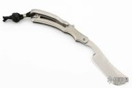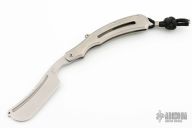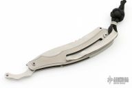 This Safadage Razor by Korth Cutlery features a stonewashed and chisel ground blade with a fuller. The handle has an orange peel finished titanium frame with matching backspacer and tip up clip. Comes with a nylon velcro case. Excellent condition.