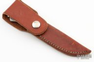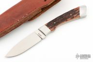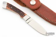 This knife by Eugene Shadley features a hand rub satin finished blade with .088" blade stock and .728" blade depth, full tang construction. The handle has dovetailed stainless steel bolsters, jigged bone scales. Coems with a brown leather sheath. Has a couple very light scratches, otherwise excellent condition. #1039 on the blade.