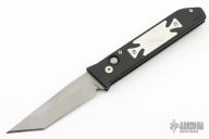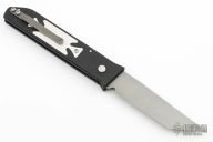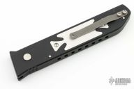 This Jammer by Rob Dalton features a bead blast chisel ground tanto blade and a black aluminum handle with an aluminum inlay. Bead blast titanium clip, tip up carry. Strong and fast coil-spring opening. Numbered 0046 on frame. Has some light scuffs, otherwise excellent condition.
