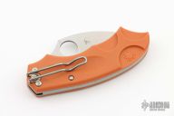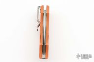Set inside the handle is a Phantom Lock that has no visible unlocking mechanism. To unlock: Settle your thumb on the divot located on the end of the folder (over the bug). Push forward, moving the handle scale downward/forward a couple millimeters releasing the blade, easily done with one-hand. Along the underside of the handle a succession of angles form placement points for the hand and channel ergonomic grip into control over the cutting edge. Steel liners inside the FRN boost the lock's strength and a double as a plate for securing screws attaching the tip-down tension-wire clip. Shaped in a modified leaf pattern, the blade is hollow-ground laminated steel with a spine cusp for thumb traction.