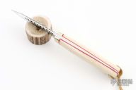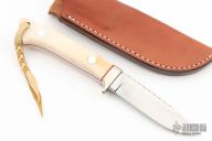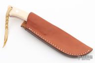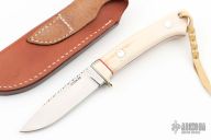 This custom knife by Keith Murr features a mirror polished drop point blade with a fileworked thumbrest, .194" blade stock, .919" blade depth, full tapered tang construction. The handle has nickel silver guard, bone scales with red liners. Great feel in the hand. Very nice work. ncludes a brown leather sheath. Has a crack in the handle on the show side. Has some light scuffs and scratches, great condition otherwise.