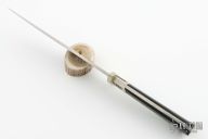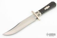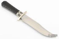 This Bowie by Craig Braschler and his wife Debra Martin features a hand rub satin finished blade with visible temper line, false top edge, .167" blade stock and 1.429" blade depth, full tang construction. The handle has a nickel silver guard, dovetailed an engraved nickel silver bolsters, ebony scales with nickel silver escutcheon and pins. Has some scratches on the blade, otherwise excellent condition.