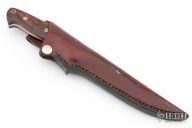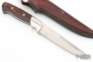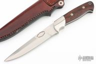 This knife by Michael Chesterman features a hand rub satin finished blade with sharpened top edge, .142" blade stock and 1.064" blade depth, full tang construction. The handle has mirror polished stainless steel bolsters and wood scales. Comes with a leather sheath with belt loop. Has a few light scratches, otherwise excellent condition.