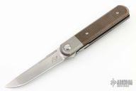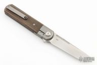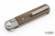 This T-1 is a Liong Mah design executed by Reate Knives. It features a two-tone bead blast finished blade with satin flats, notched thumbrest, fullers and flipper. The handle has a blasted bolster lock frame with micarta scales, and a matching tip up clip. Comes with velcro pouch, patch and maker's card. Has a couple of light scuffs on the blade, otherwise excellent condition.
