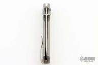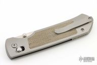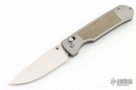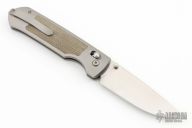 This Goat A.X.L. by Ohlone Knives features a tumble finished blade with dual thumbstuds. The handle has a bead blasted titanium frame with green canvas micarta inlays, bead blasted titanium clip and hardware. Nice lockup and blade seating. Comes with zippered case and pen. Excellent condition.