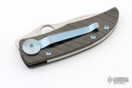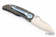 Very sought after and difficult to find. This is the first knife designed for Spyderco by the famous knifemaker Michael Walker, inventor of the liner lock. This unique Spyderco has the disctinction of being Swiss Made, in the same factory that produces the very well-made Klotzli Knives, of which many are also designed by Michael Walker. This one is early production with ATS-34. Great little linerlock with blue anodized pivot and liner. Satin finish spear point blade is numbered 20. Matte carbon fiber scales. Tip down carry clip of blued titanium. Nice blade seating, lockup and detent. Excellent condition. Comes with original zippered case and papers.