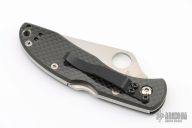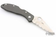 This Left Handed Delica by Spyderco has a satin finished fully serrated blade with thumbhole opener and notched thumbrest. The handle has carbon fiber scales and an up or down reversible stainless clip. Comes with original box. Excellent condition. #082V