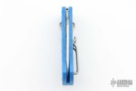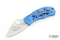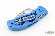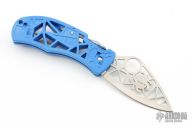 This Q Knife front-lock folder by Spyderco has a skeletonized satin finished stainless steel blade with unique, clip-style front lock. Handle is blue skeletonized polymer with 4-way reversible clip and lanyard hole. Excellent condition. Comes with original box and papers. #13of75. 1979-2003