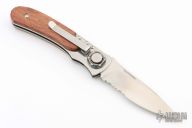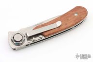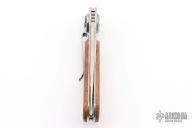 This Paul Prankster has a satin finished clip point blade with notched thumb rest. Handle is African Rosewood over stonewashed stainless steel frame. Stainless steel tip down clip. Excellent condition. Very nice piece. Comes with original box and papers.