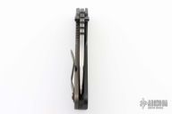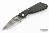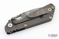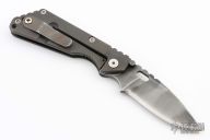 This SnG GenII by Strider features a tiger striped blade and a black G-10 and bead blasted titanium handle and titanium clip. Notches on thumbrest, rear of handle, and lockup. Nice detent, lockup and blade seating. #063 on blade. Has scuffs, scrathces, has been used carried and resharpened, otherwise good user condition.