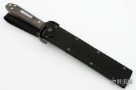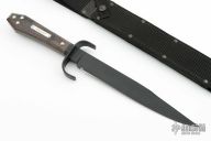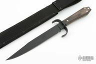 This is a discontinued Bill Bagwell designed Bowie, made by Ontario Knife, features a black coated blade with false top edge, .304" blade stock and 1.345" blade depth, hidden tang construction. The handle has a black stainless steel guard, wooden coffin shaped handle with nameplate. Comes with original box and black nylon sheath. Has a couple light scuffs, otherwise excellent condition.