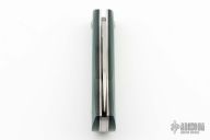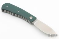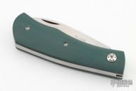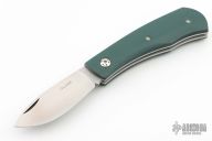 This slipjoint by David Lancaster Clark features a satin finished blade with nail nick. The handle has green G-10 covers with black liners, 410 stainless steel liners and a stainless steel spring. Has half-stop. Flush in all position. Comes with a leather slip sheath. New from maker. Comes with COA.