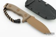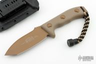 This Currahee by Microtech has a tan tanto blade with a standard edge and tan polymer scales. 3/16" blade stock and 1 1/2" blade depth, full tang construction. Dated 06/2022 and S/N 5164. Comes with kydex sheath with molle lock, original box and papers. Excellent condition.