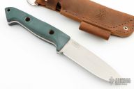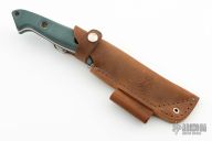This Bushcrafter from Benchmade features a drop point tumble finished blade with .165" blade stock and 1.156" blade depth, full tang construction. The handle has a green G10 scales over red liners and full tang construction with hollow pins and a lanyard tube with lanyard. Includes leather sheath with a belt loop. Excellent Condition.