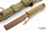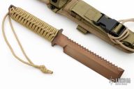 This ED CuBe EOD Knife by Strider features a copper beryllium blade with serrated spine, .274" blade stock and 1.294" blade depth, full tang construction with tan paracord wrapped handle. Comes with a nylon sheath. Has some scuffs, otherwise excellent condition. This one is stamped "S30V" on the guard, but it is clearly Copper Beryllium.