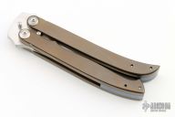 This Balisong by Tashi Bharucha is marked on the blade "Robert W. Loveless Legacy", it features a hand rub satin finished blade with false top edge. The handles are bead blasted and anodized titanium with MokuTi spacers. Comes with a zippered case. Excellent condition. Very classy balisong!