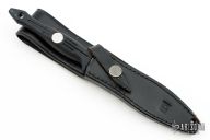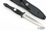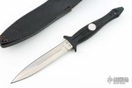 This Shadow I from Al Mar Knives features a doubled edge dagger style satin finished blade, .142" blade stock and .747" blade depth. The handle is comprised of zytel over hidden tang construction with lanyard hole in pommel. Comes with black leather sheath. Excellent condition.