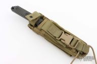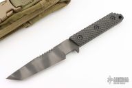 This VG by Strider features a tiger striped blade with serrated top edge and notched thumbrest, .249" blade stock and 1.306" blade depth, full tang construction. The handle has black G-10 gunner grip scales. Comes with a nylon sheath. Excellent condition.