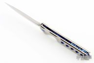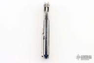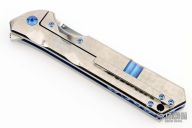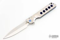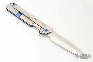 This Rainmaker by Olamic Cutlery features a mirror finished blade with a notched flipper and false top edge. The handle has a contoured and jeweled titanium frame with matching titanium tip up pocket clip and carved anodized titanium backspacer. Nice detent, blade seating and lock up. Includes original zippered case and COA dated 9-21-21. Excellent condition. RFL249-D