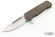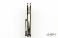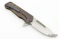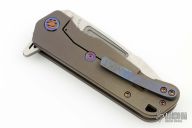 This Proxima by Medford Knife and Tool featured a stonewashed spear point blade with fullers and a notched flipper tab. The handle is composed of anodized fade tumbled finished titanium, anodized hardware and tip up pocket clip with a lanyard hole. Includes the original box and papers. Excellent Condition.