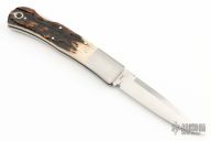 This medium PF (Pocket Fighter) lockback by Jess Horn features a hand-rubbed satin finish blade with false top edge and nail nick. The handle has satin stainless steel bolsters and liners with stag scales. Opens and closes with a nice snap. Nice lockup, blade seating and function. Outstanding fit and finish. Numbered 043 on back of blade. Comes with a zippered case. Excellent condition.
