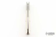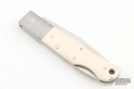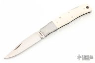 This stunning lockback folder by Jess Horn features a hand rubbed satin finished blade with nail nick. Satin finished stainless steel bolsters with mammoth ivory scales, hand peened nickel silver pins, and stainless steel liners. Satin finished stainless steel lockbar and black linen micarta backspacer, and butt of handle has lanyard hole. It is a truly beautiful knife. Numbered 011. Nice lockup and blade seating. Excellent condition. Comes with a felt case.