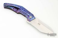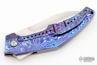This knife by Tashi Bharucha features a hand rub satin finished recurve blade with false top edge and a flipper. The handle has a full Timascus frame, backspacer, tip up Timascus clip. Rides on bearings, nice detent, lockup and blade seating. Comes with zippered case. Excellent condition.