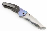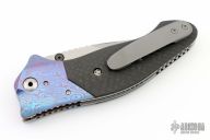 This Gordian Knot features hand rub satin finished San Mai blade with notched thumbrest, false top edge and single thumbstud. The handle has timascus bolsters, carbon fiber scales, "crushed ice" finished titanium liners, C-Tek backspacer, tip up stainless steel clip. Nice detent, lockup and blade seating. Excellent condition.
