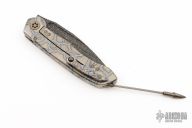 This Anax by Marfione Custom Knives features a Ball Bearing Damascus blade with notched thumbrest. The handle has an integral tumbled and flamed titanium frame with optional lanyard attachment. Tip up titanium clip with silicon nitride ball bearing. Nice detent, lockup and blade seating. Comes with a Marfione Custom Knives box for a different Anax, original zippered case and COA dated 05/2015 and S/N 004. Excellent condition.