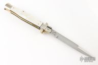 This Picklock Auto by Renzo Passcotto features a mirror finished blade with unsharpened edges. The handle has mother-of-pearl scales with black linen micarta liners, brass liners and nickel silver bolsters. Has safety. Has a crack on the front scale, otherwise excellent condition. 50 of these were made, only 5 of them were made with mother of pearl.