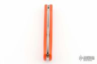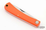 This Farm and Field Tool Bullnose by Great Eastern Cutlery features a satin finished drop point blade with swedge and nail nick. The handle has orange delrin covers with brass pin and lanyard tube over stainless steel liners and backspring. Excellent condition. Includes original cardboard tube packaging and wax paper wrapping.