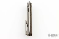 This Trevor Burger design by Urban EDC features a stonewashed blade with notched front flipper. The handle has a tumbled titanium frame with a green canvas micarta front scale with a black canvas micarta inlay, matching tip up clip and backspacer. Comes with an original box and zippered case. Excellent condition.