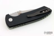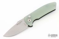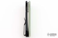 The Protech Knives SBR (Short Bladed Rockeye) is a utilitarian, compact, every-day-carry version of the Les George iconic Rockeye model, retaining the classic design in a smaller package. The SBR has the same American innovations as the Rockeye, featuring modern materials, high tech manufacturing, advanced coil spring mechanism, and quality American production. This version of the SBR has a stonewashed finished S45VN stainless plain edge blade, black anodized aluminum and jade g10 handles and satin hardware. Comes with original box and papers. Excellent condition.