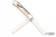 This Trapper by Case features 2 mirror polished blades with nail nicks. The handle has nickel silver bolsters, scrimshawed bone covers, with a nickel silver Case shield, brass liners and stainless springs. Includes Case box and papers. Excellent condition.