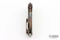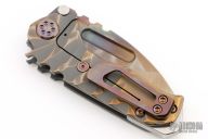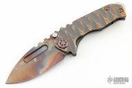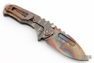 This Micro Praetorian from Medford Knife and Tool features a Vulcan finished drop point blade with notched thumbrest and fullers. The handle has a sculpted and anodized titanium frame with an anodized titanium tip up pocket clip. Stainless steel backspacer doubles as a glass breaker. Includes a padded zippered case and coa.  Excellent Condition.