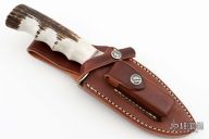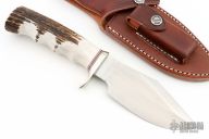 This knife has a satin finished stainless steel blade, with sharpened top edge and notched thumbrest, .237" blade stock and 1.830" depth, hidden tang construction. The handle has nickel silver guard and a stag handle with finger grips, red/white/blue spacers. Comes with Brown leather sheath and original paper wrapping. New from maker.