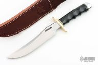 This Model 3-7 Recon Style Fighter by Randall Made Knives features a satin finished blade with a false top edge, .194" blade stock and 1.214" blade depth, hidden tang construction. The handle has brass double guard, finger groove black linen micarta grip, black/brass spacers, duralumin butt. Comes with a brown leather sheath and original paper wrapping. New from maker!