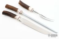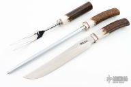"Designed to meet every requirement as the ideal table knife, it is rustproof and will resist staining as ordinary blades do when used in carving meat. Complete with high-quality stag handled Sharpening Steel and Fork. A three-compartment felt case is included. " Satin finished blade with .179" blade stock and 1.225" blade depth, hidden tang construction. Nickel silver guards with stag grips and red/white/blue spacers. Comes with cloth rollup, and original papers. New from maker!