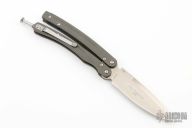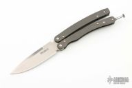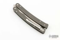This Mayhem Balisong by Bradley Cutlery features a tumble finished spear point blade with swedge and notched thumb rest. The handle is comprised of blasted titanium over blue anodized aluminum barrel spacers. The stainless steel pocket clip is positioned for tip up carry. Steel T latch on pommel. New condition. Comes with original box and papers.