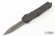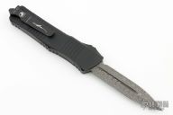 This Combat Troodon by Microtech Knives features a Damascus double edged blade. The handle is black aluminum and carbon fiber, ringed anodized titanium screws, and a black stainless steel pocket clip. The handle is marked "A. Marfione" and dated 10/21 and #189 on spine of handle and claw logo. Excellent work. Comes with original box and papers. Excellent condition.
