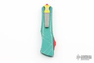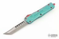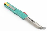 This Combat Troodon Bounty Hunter by Microtech Knives features a Hellhound tanto blade with fullers, satin flats and apocalyptic finished grinds. The handle has a green battle worn aluminum handle with red hardware, tip down apocalyptic finished stainless steel clip.  Includes the original box.  Excellent condition. Dated 05/2023 s/n 3120.