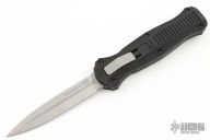 "Introducing an OTF like none-other.. The new Infidel® is rapidly making believers out of many a skeptic. Built for strength and reliability the patent pending double-action mechanics get it done over the long haul. Grab on and you will find the handle grip rock-solid with its patented machined in Presidio® style bi-directional tread pattern, and overall generous sizing for gloved hands. Intuitively pressure the release-slide forward and its spear-point edged steel fires and locks up with a unique three-point retention system with amazingly negligible blade play. Reverse the process and the blade retracts in a rapid blur of motion. The Benchmade Infidel is a special operator’s fantasy come true." Comes with original box, papers and sheath. Excellent condition.