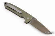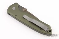 This Rockeye Auto by Pro-Tech has a "smoky gray" DLC blade with notched thumbrest. The handle has a green textured aluminum frame with a bead blast steel tip up pocket clip. Typical flawless Pro-tech mechanics and blade seating. Comes with original box and papers. Excellent condition.