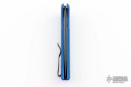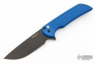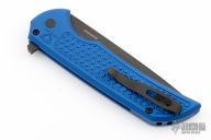 This Mordax by Pro-Tech is a Ferrum Forge design and features a black drop point blade. The handle has milled a blue aluminum frame with black tip up stainless steel clip. Black Lip Pearl inlaid push button. Comes with original box and papers. Excellent condition.
